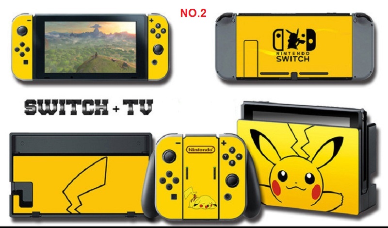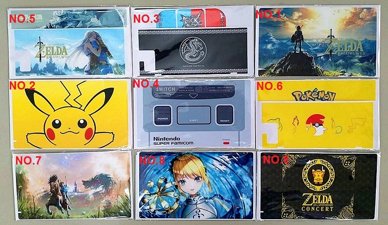 Một bộ Skin bao gồm : miếng dán sau thân máy Nintendo Switch Console, mặt trước và sau Dock, mặt trên Joy‑Con Grip, mặt trên Joi-Con phải và Joi-Con trái.